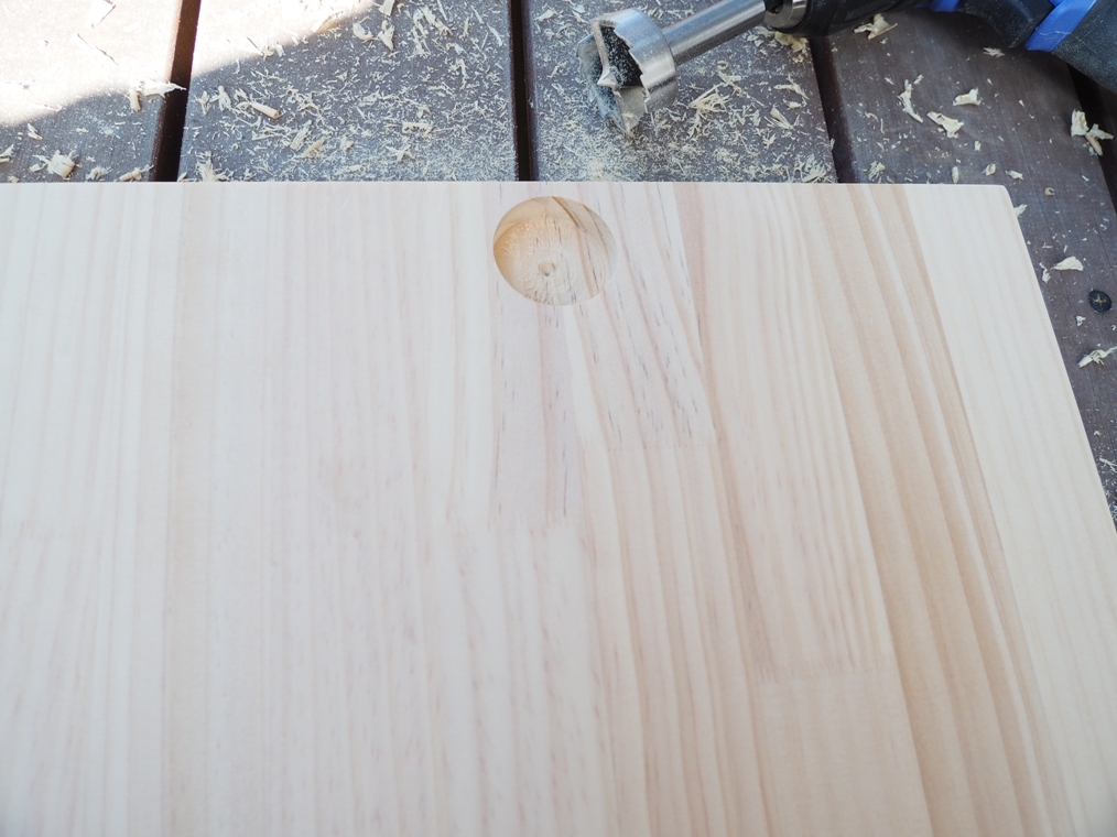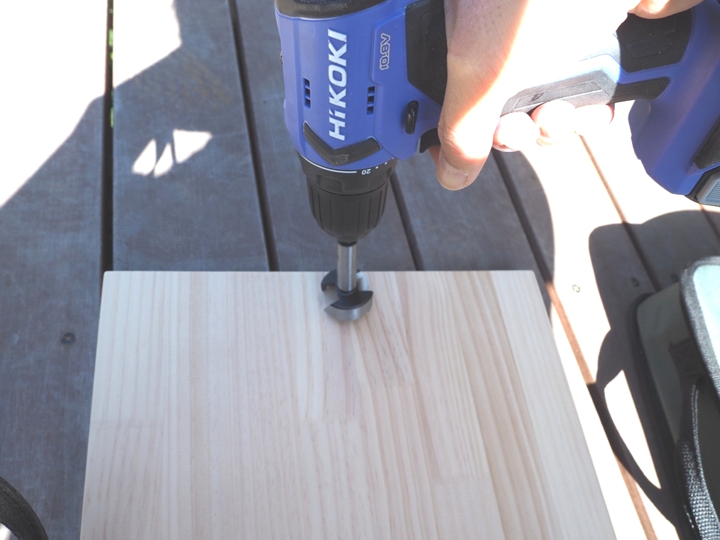 直径35mmの穴は木工用ボアビットを使って電動ドリルで掘ります。